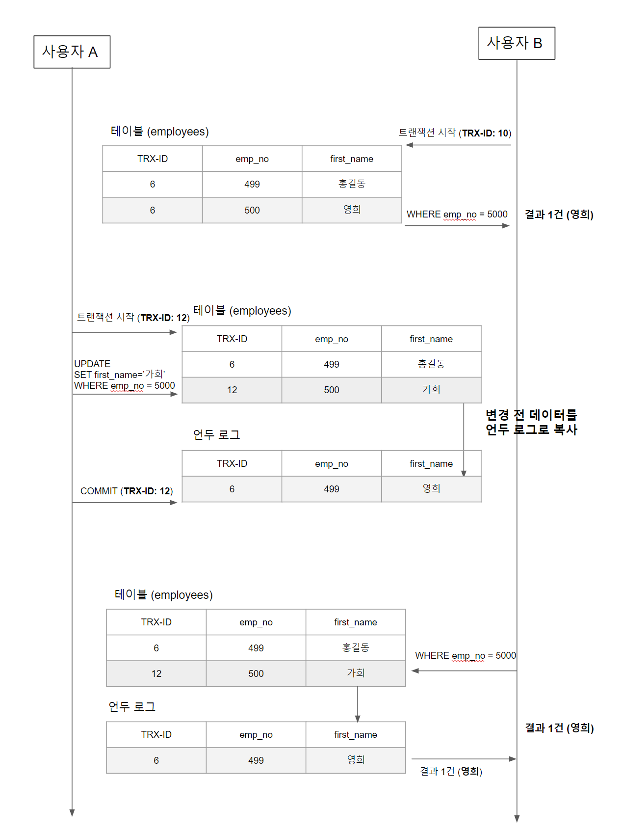모든 InnoDB의 트랜잭션은 고유한 트랜잭션 번호를 가지며, 언두 영역에 백업된 모든 레코드에는 변경을 발생시킨 트랜잭션의 번호가 포함돼 있다. 아래 그림은 트랜잭션이 끝나지 않은 사용자 B가 변경된 정보를 조회하는것을 도식화 한것이다.