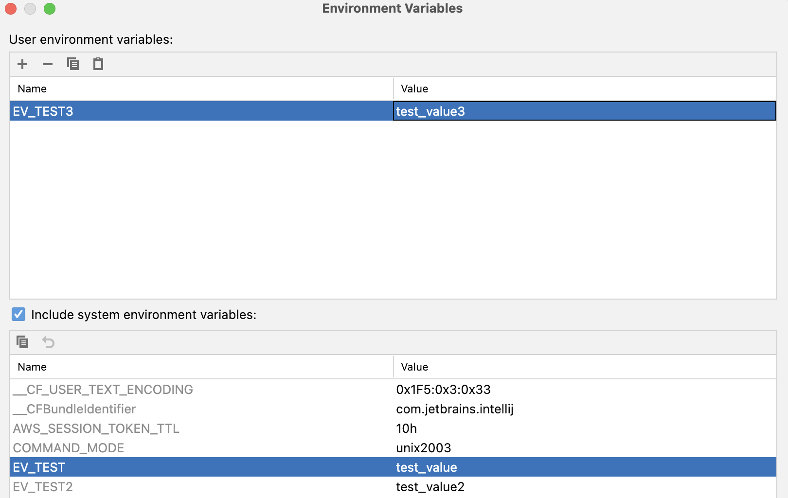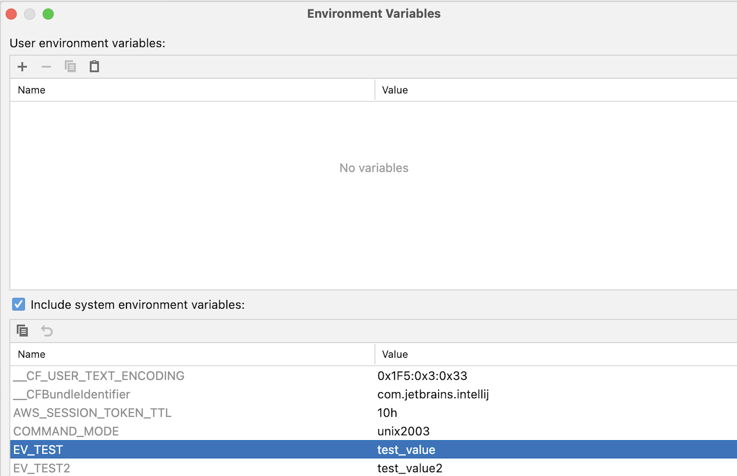 IntelliJ에서 앱을 실행할 경우, 실행하는 앱의 시스템 환경변수 또는 시스템 프로퍼티를 확인하고 유저 환경변수와 유저 프로퍼티를 직접 설정해줄 수 있다.