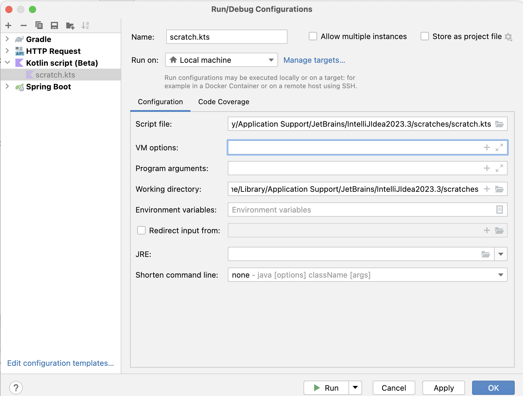 그러면, 스크레치 파일 실행에 대한 환경을 설정해줄 수 있는 팝업(Run/Debug Configurations)이 하나 뜬다.