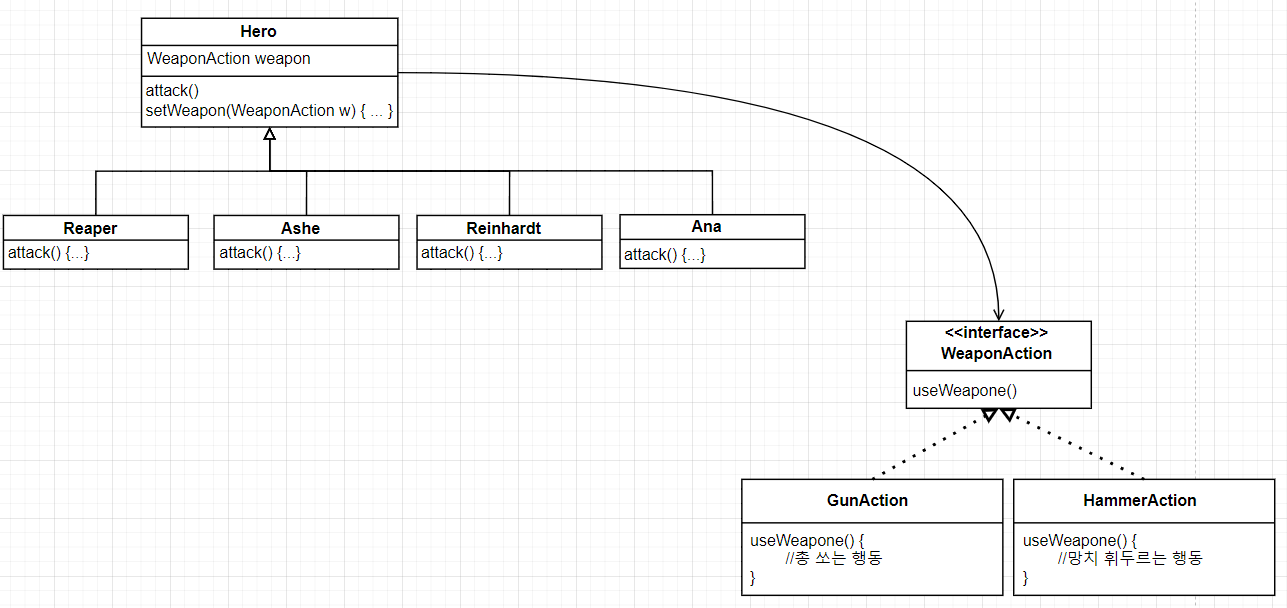 영웅(Hero) 객체의 하위에는 리퍼(Reaper), 애쉬(Ashe), 라인하르트(Reinhardt), 아나(Ana)가 있다. 처음, 라인하르트는 망치를 휘두르며 공격하고, 리퍼, 애쉬, 아나는 총으로 공격한다고 정의한다. 영웅 객체는 주입받은 행동에 따라 공격 방식을 바꾼다. 라인하르트에 HammerAction 객체를 GunAction으로 변경하면 총으로 공격하도록 변경할 수도 있다.