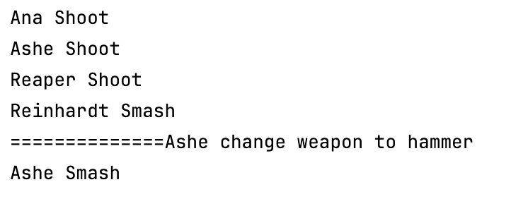fun main() { val gun = GunAction() val hammer = HammerAction() val ana = Ana().apply { this.setAction(gun) } val ashe = Ashe().apply { this.setAction(gun) } val reaper = Reaper().apply { this.setAction(gun) } val reinhardt = Reinhardt().apply { this.setAction(hammer) } ana.attack() ashe.attack() reaper.attack() reinhardt.attack() println("==============Ashe change weapon to hammer") ashe.setAction(hammer) ashe.attack() }3. 실행 결과