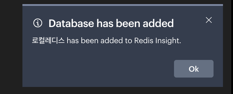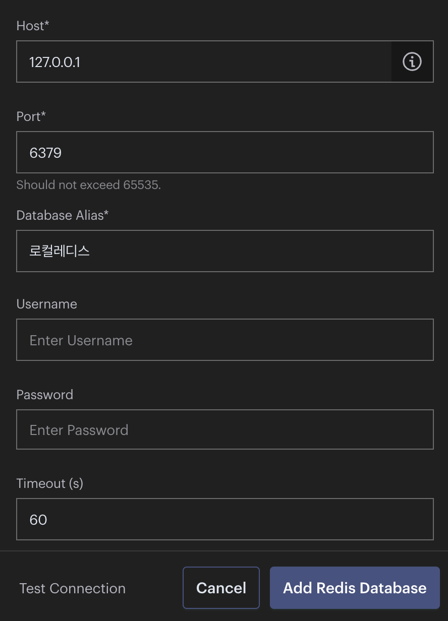 - brew설치 후 변경해준 것은 없으므로, Database Alias만 변경해서 "Add Redis Database"를 클릭한다.