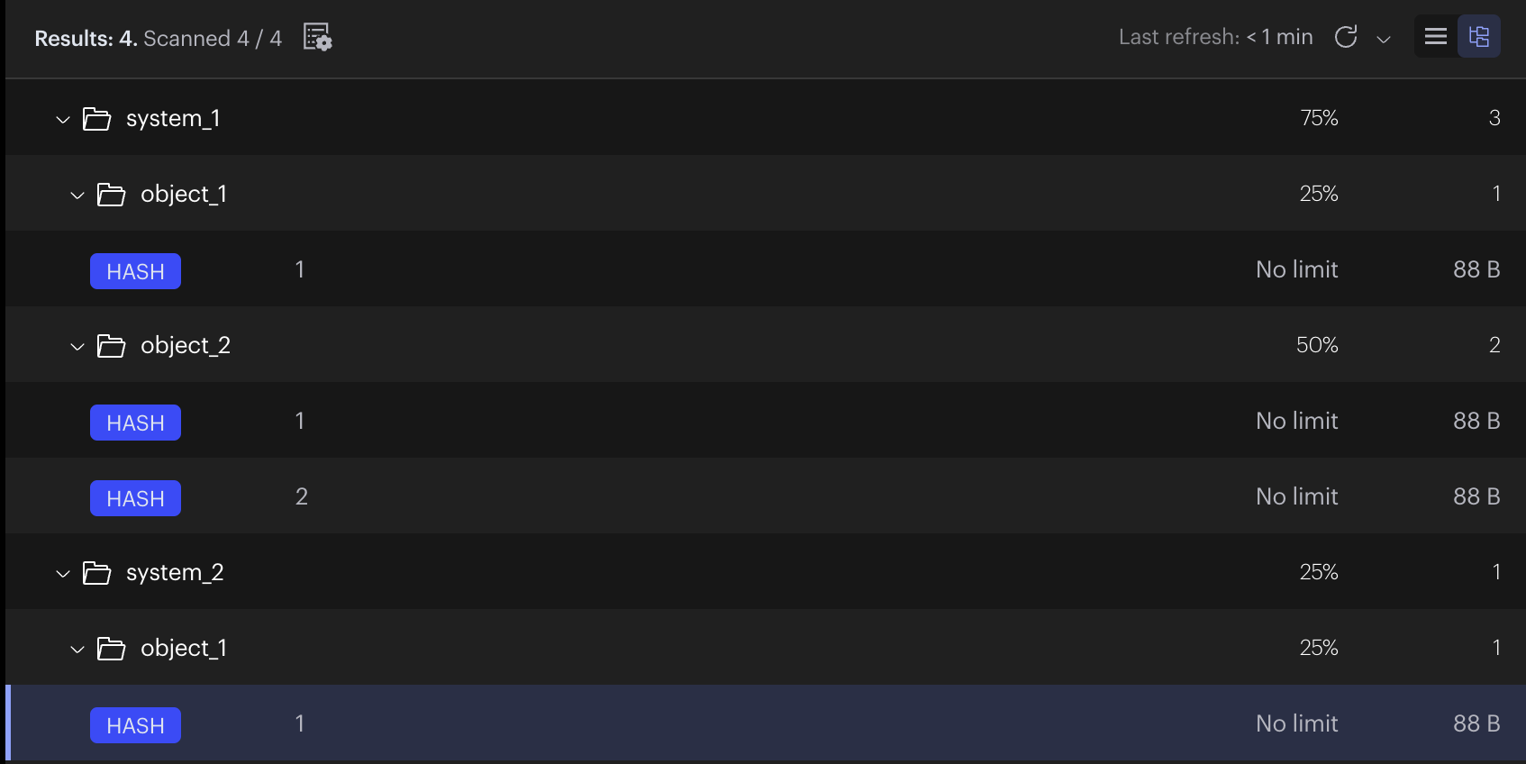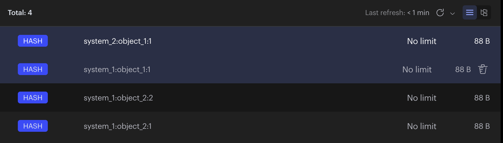 키 값 system_1:object_1:1 키-값 system_1:object_2:1 키-값 system_1:object_2:2 키-값 system_2:object_1:1 키-값 - system_1, system_2에 총 4개의 레디스 데이터가 생성됐다.
