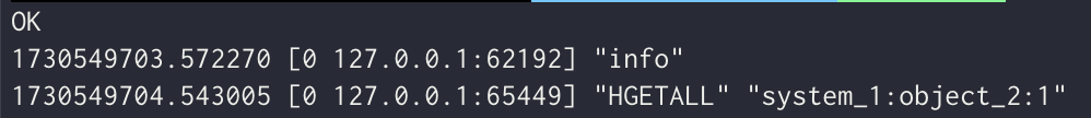 레디스 서버 로그 모니터링을 시작한 후 HGETALL system_1:object_2:1 이라는 명령한 것을 알 수 있다.