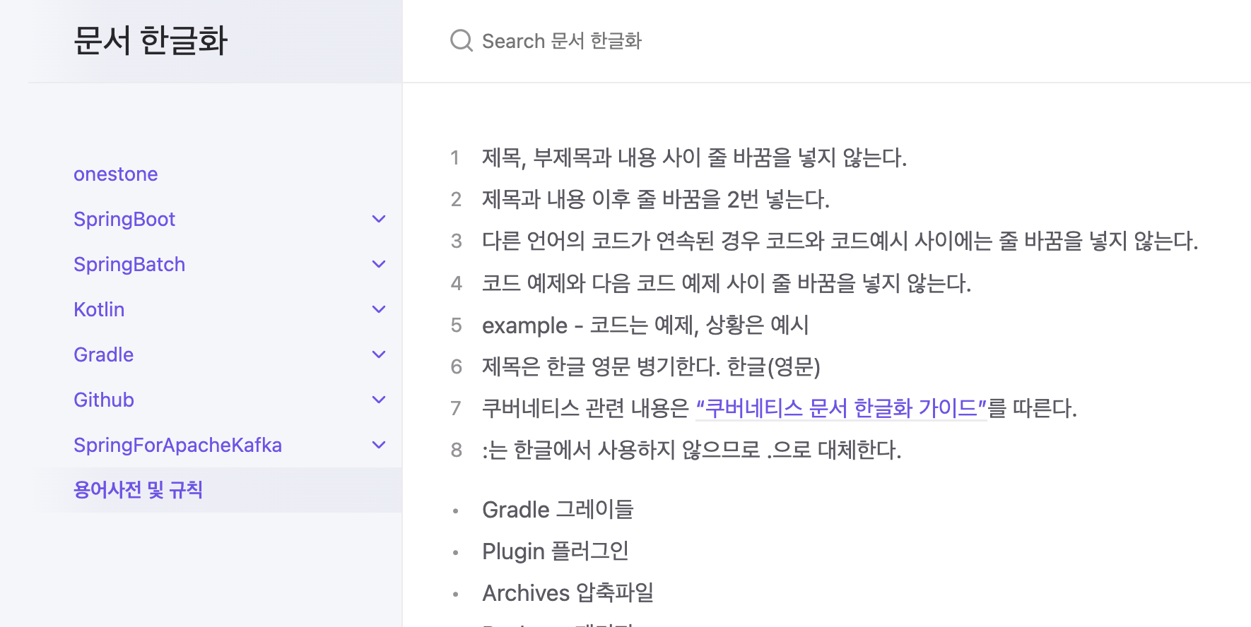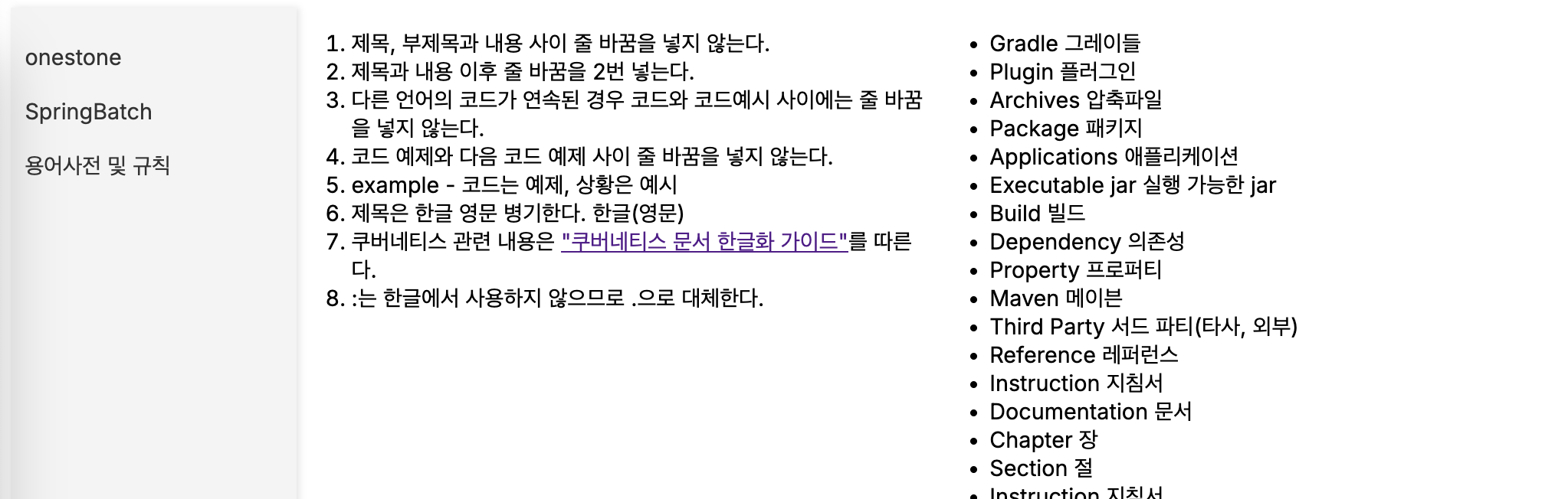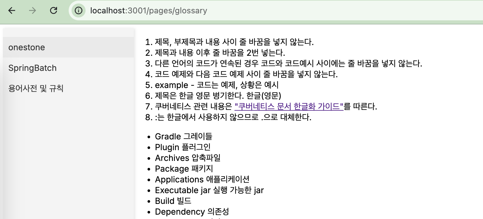 // @/app/pages/glossary/page.tsx 파일 import ReactMarkdown from 'react-markdown'; import MainSidebar from '@/app/Sidebar'; import styles from '@/app/module/Contents.module.css'; const markdownText = ` ... 6. 제목은 한글 영문 병기한다. 한글(영문) 7. 쿠버네티스 관련 내용은 ["쿠버네티스 문서 한글화 가이드"](https://kubernetes.io/ko/docs/contribute/localization_ko/)를 따른다. 8. :는 한글에서 사용하지 않으므로 .으로 대체한다. - Gradle 그레이들 - Plugin 플러그인 ... `; export default function Glossary() { return ( <div className={styles.container}> <MainSidebar /> <div> <ReactMarkdown>{markdownText}</ReactMarkdown> </div> </div> ); }3. 용어사전 및 규칙 페이지 완성