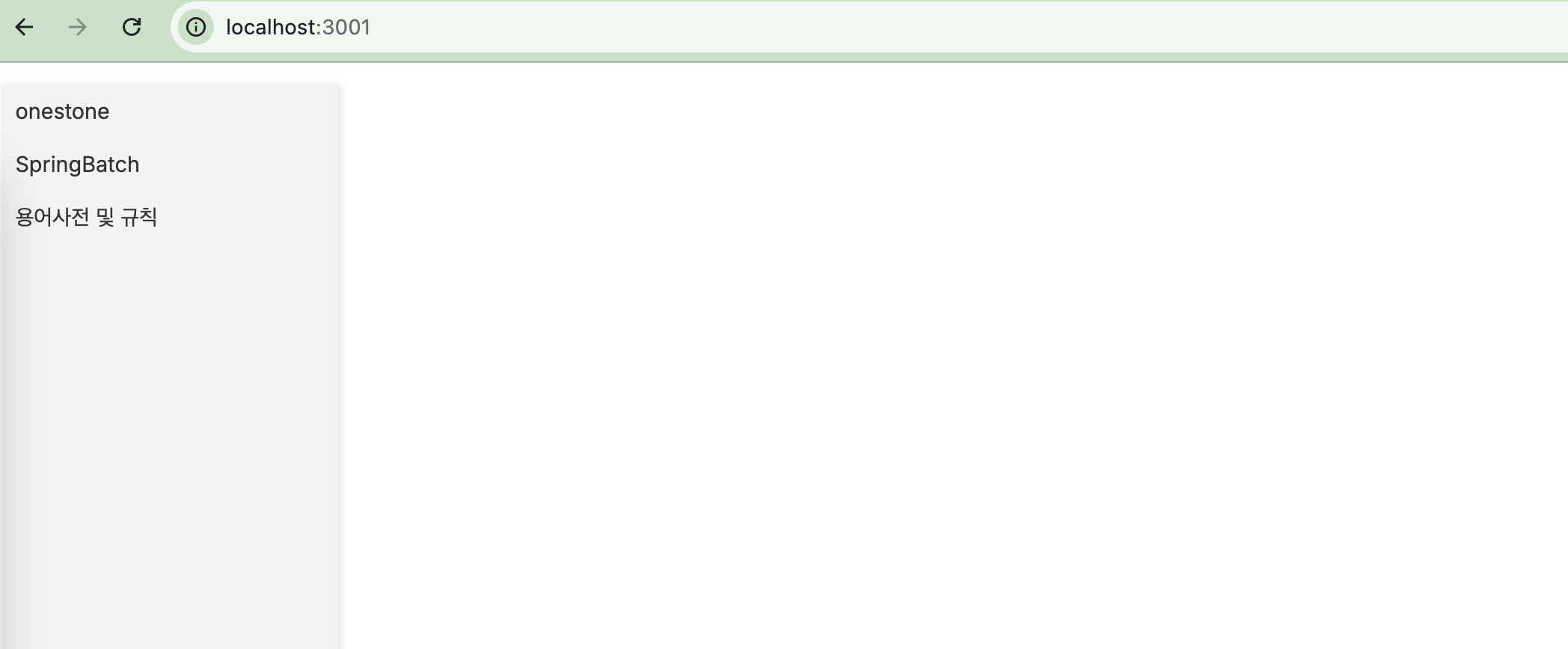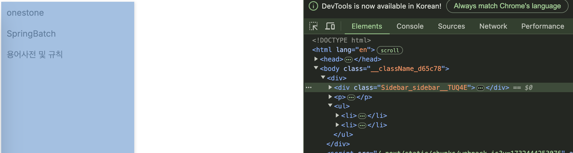 // ./module/Sidebar.tsx import Link from 'next/link'; import styles from './Sidebar.module.css'; const Sidebar: React.FC = () => { return ( <div className={styles.sidebar}> <ul> ... <li> <Link href="/pages/glossary">용어 사전 및 규칙</Link> </li> </ul> </div> ); };내가 원한 것은 왼쪽에 사이드바가 뜨고, 오른쪽에 페이지가 나오는 것이다. 하지만, 페이지를 확인해보니 사이드바 아래 페이지가 나왔다.