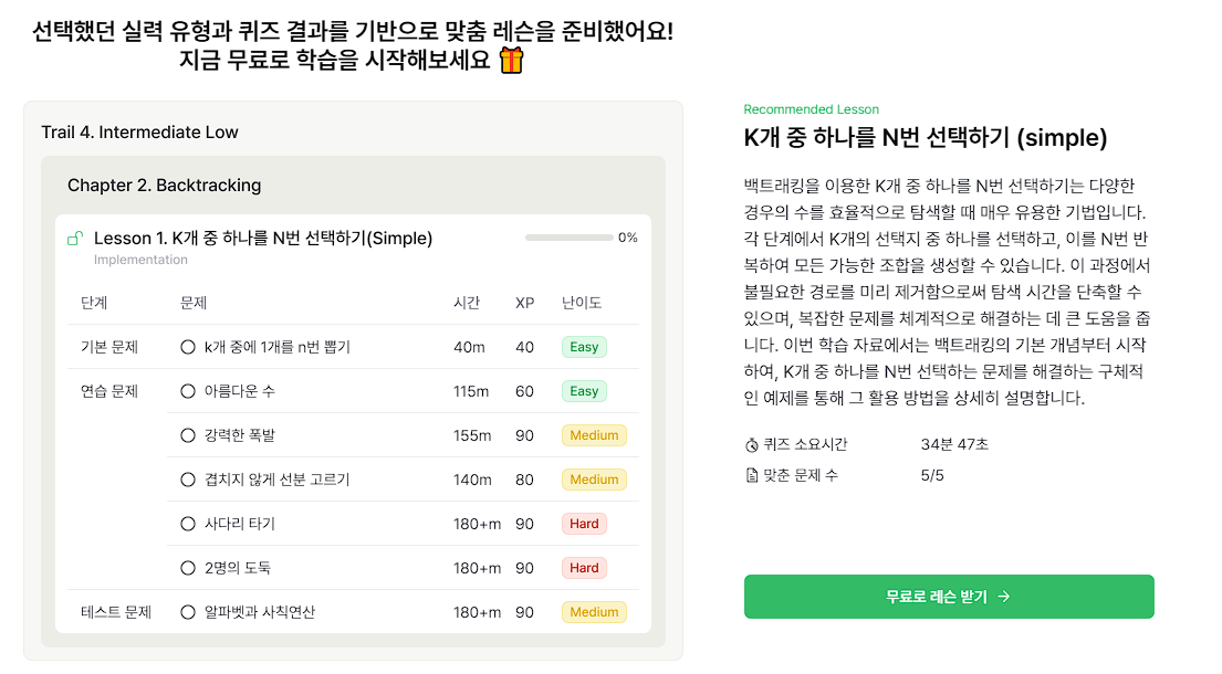 다섯 문제를 모두 풀고나면, 아래와 같이 적당한 레슨을 분석해서 알려준다.