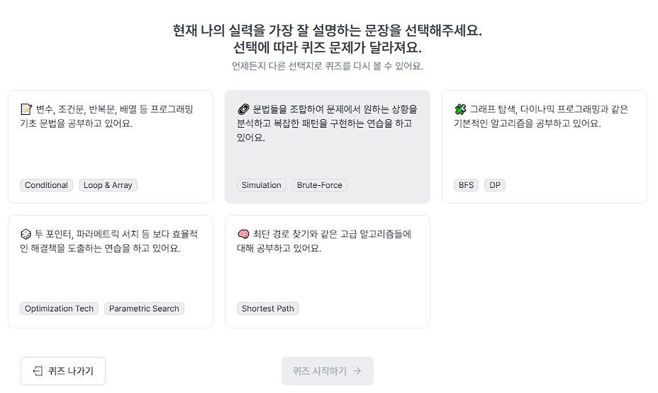 내 실력 가늠이 가능하다면 맞는 Trail을 찾아서 시작하겠지만, 내 실력도 가늠이 불가능한 상태에서는 어떤 문제부터 접근하는게 좋은지 고민이 됐다. 고민되는 사람을 위해 퀴즈 풀기 기능이 있는 것 같다. 퀴즈는 총 다섯 문제고, 객관식이다. 언어는 자바스크립트, 파이썬, C/C++ 세 가지로 구성된다.