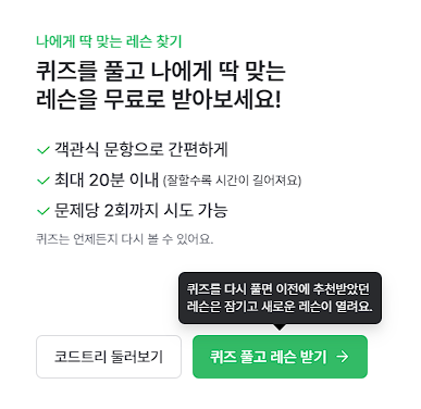 다시 퀴즈 풀기를 누르면, 이전 추천 레슨은 잠기고 새로운 레슨이 열린다고 한다. 모든 레슨이 열려있는데, 잠긴다는게 무슨 소린진 모르겠다만, 경고창이 뜬다. 퀴즈를 다시 풀어봤는데 다섯 문제중 일부는 문제가 똑같아서 외워서 풀었던 것도 있다.