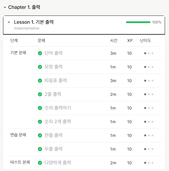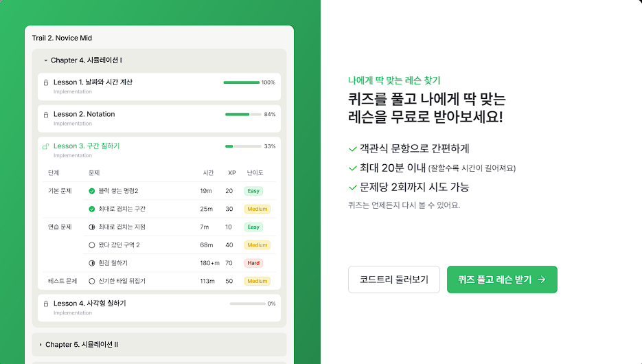 크게 "Trail > Chapter > Lesson > 문제"로 구성된다. 내 알고리즘 실력이 어느 정도 되는지 알고 있다면 Trail부터 선택해서 문제풀이를 시작하면 된다.