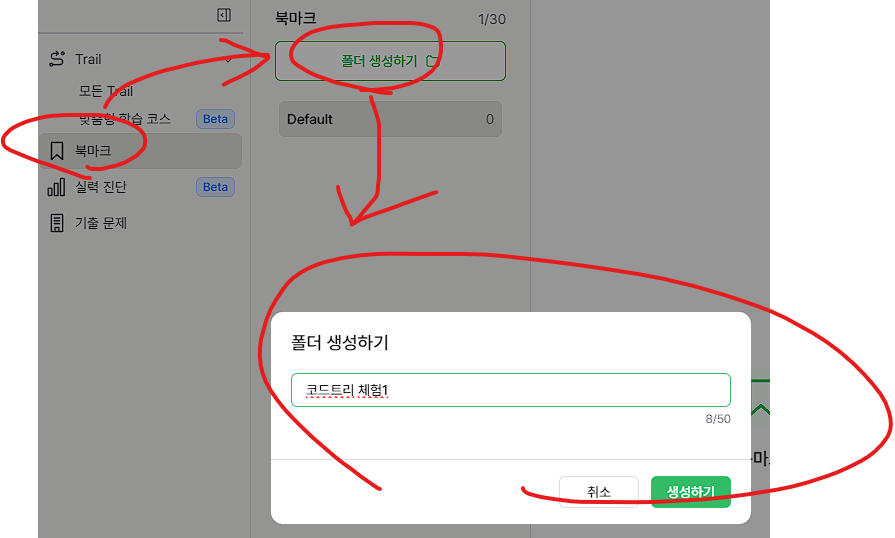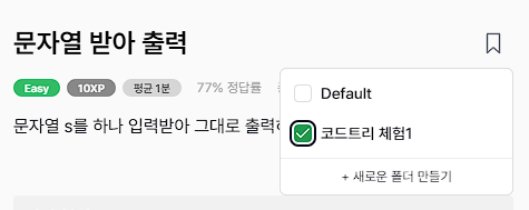 알고리즘 문제를 북마크해서 폴더별로 저장할 수 있다. 북마크 > 폴더 생성하기 > 폴더 이름(코드트리 체험1) 순으로 만들면 나만의 폴더가 생성된다.